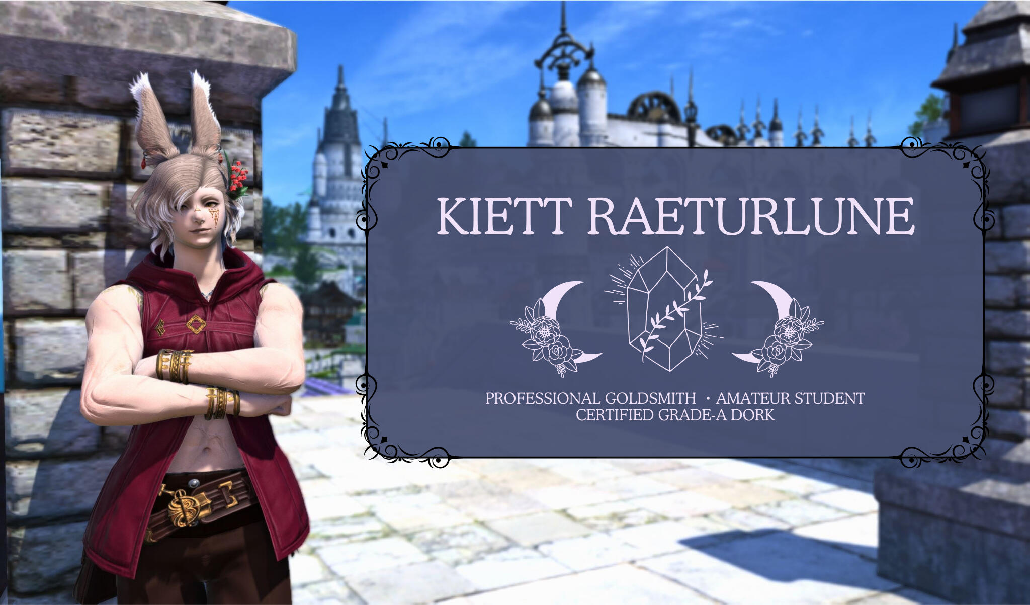 Kiett is currently a Journeyman Goldsmith-- one quite respected within the guild as an up-and-coming artist, but still with things to learn. He's always searching for further training in his field, especially in places other than Eorzea. These are his journeyman years after all! If you're an expert in any field even remotely related to goldsmithing (and for Kiett, most fields can trace back to goldsmithing eventually) he would love to learn from you!. NEW STUDENT .